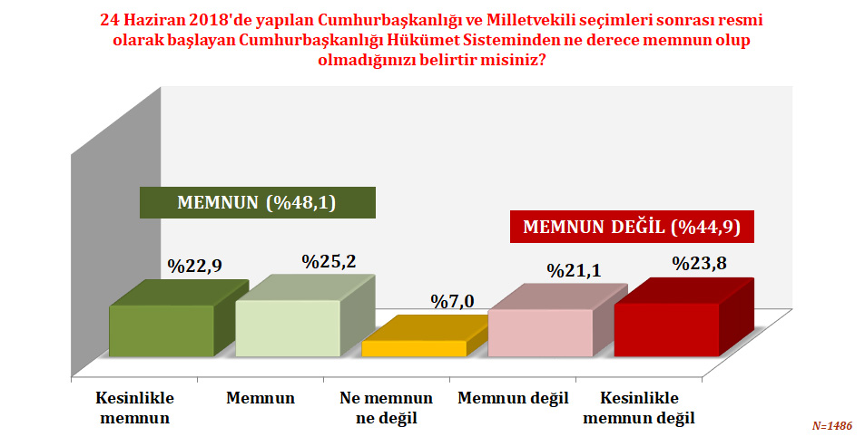 Araştırmaya katılanların %23,5’i Cumhurbaşkanlığı Hükümet Sisteminden «kesinlikle memnun olmadığını», %20,9’u «memnun olmadığını», %7,0’si «ne memnun ne olmadığını», %25,0’i «memnun olduğunu», %22,7’si «kesinlikle memnun olduğunu» belirtirken %0,2’si «Cumhurbaşkanlığı Hükümet Sisteminden memnun olup olmadığını bilmediğini» belirtmiş %0,7’si soruya cevap vermemiştir.