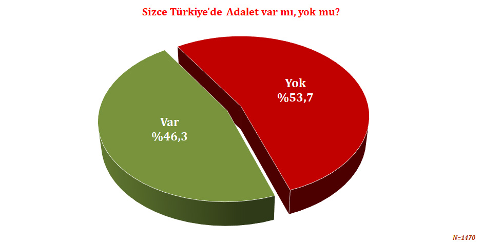 Araştırmaya katılanların %45,4’ü Türkiye’de Adalet «olduğunu», %52,6’sı «olmadığını» belirtirken %1,5’i «bilmediğini» belirtmiş %0,5’i soruya cevap vermemiştir.